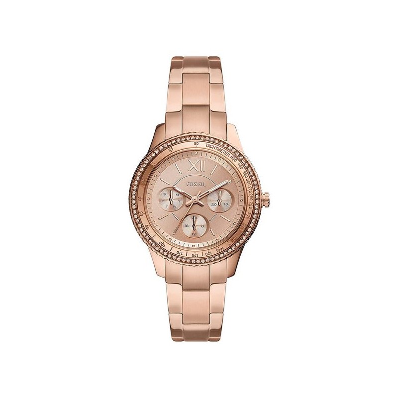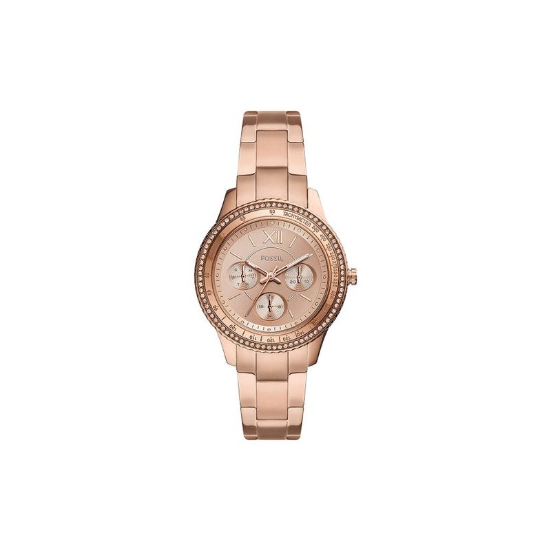 Dale a tu atuendo un toque especial con este atractivo reloj, cuenta con un acabado color oro rosa y adornado con cristales pequeños que lo hacen lucir elegante, es de funcionamiento analógico, movimiento de cuarzo, con caja y extensible de acero inoxidable